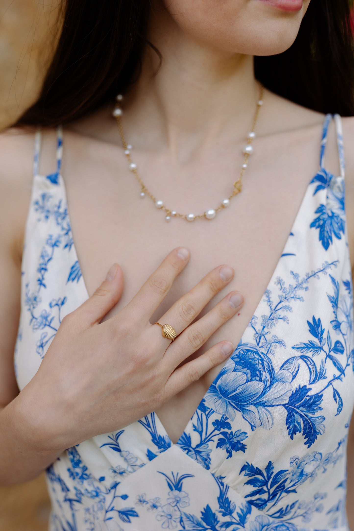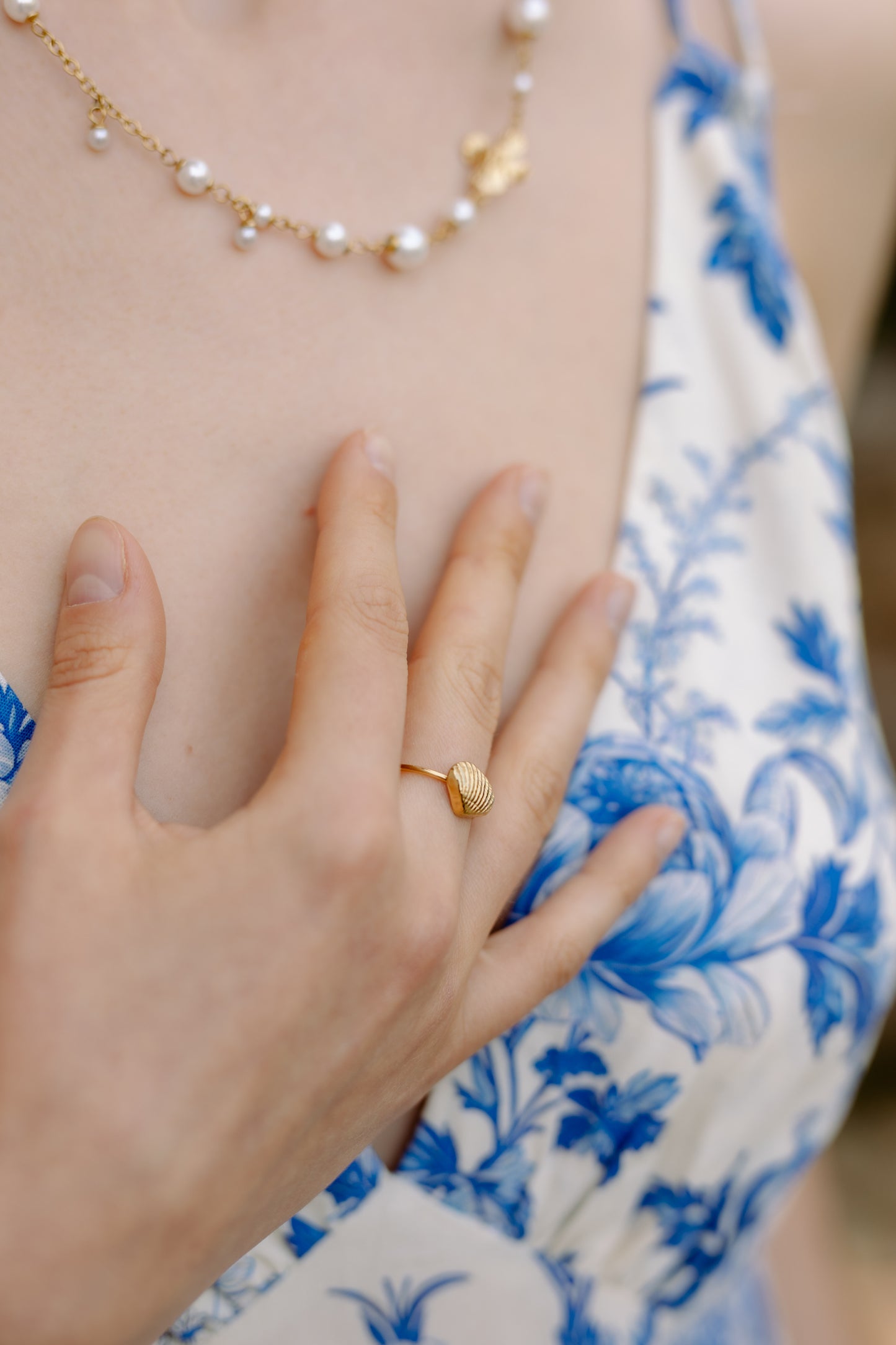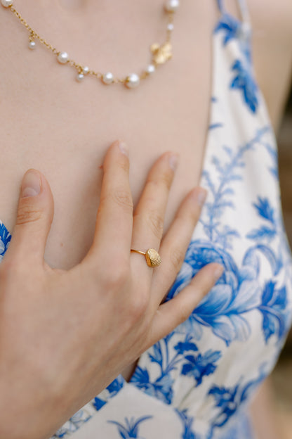 Bague fine réglable en acier inoxydable, ornée d’un petit coquillage. Un bijou discret et élégant, idéal pour compléter un look d’inspiration bord de mer.