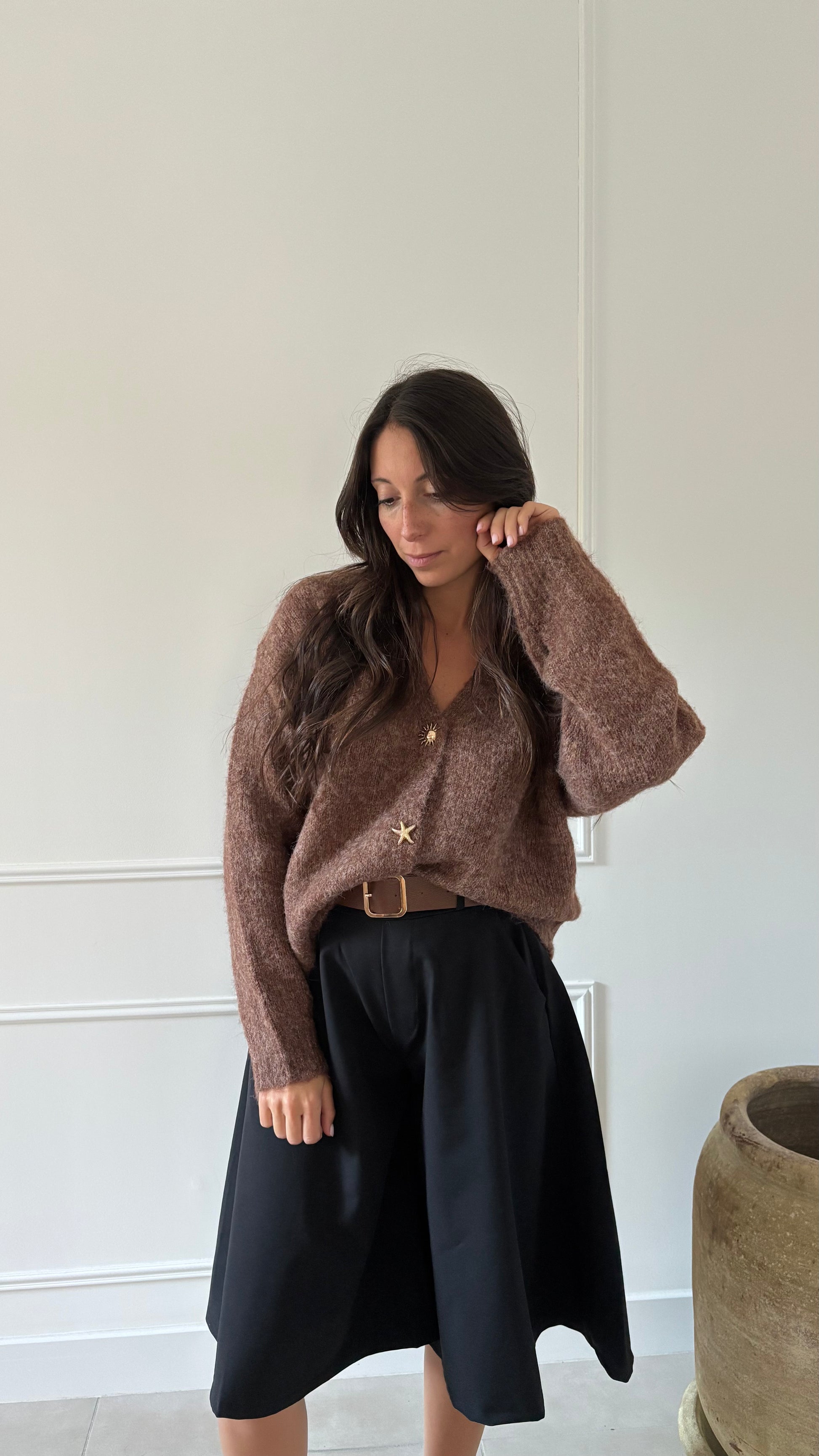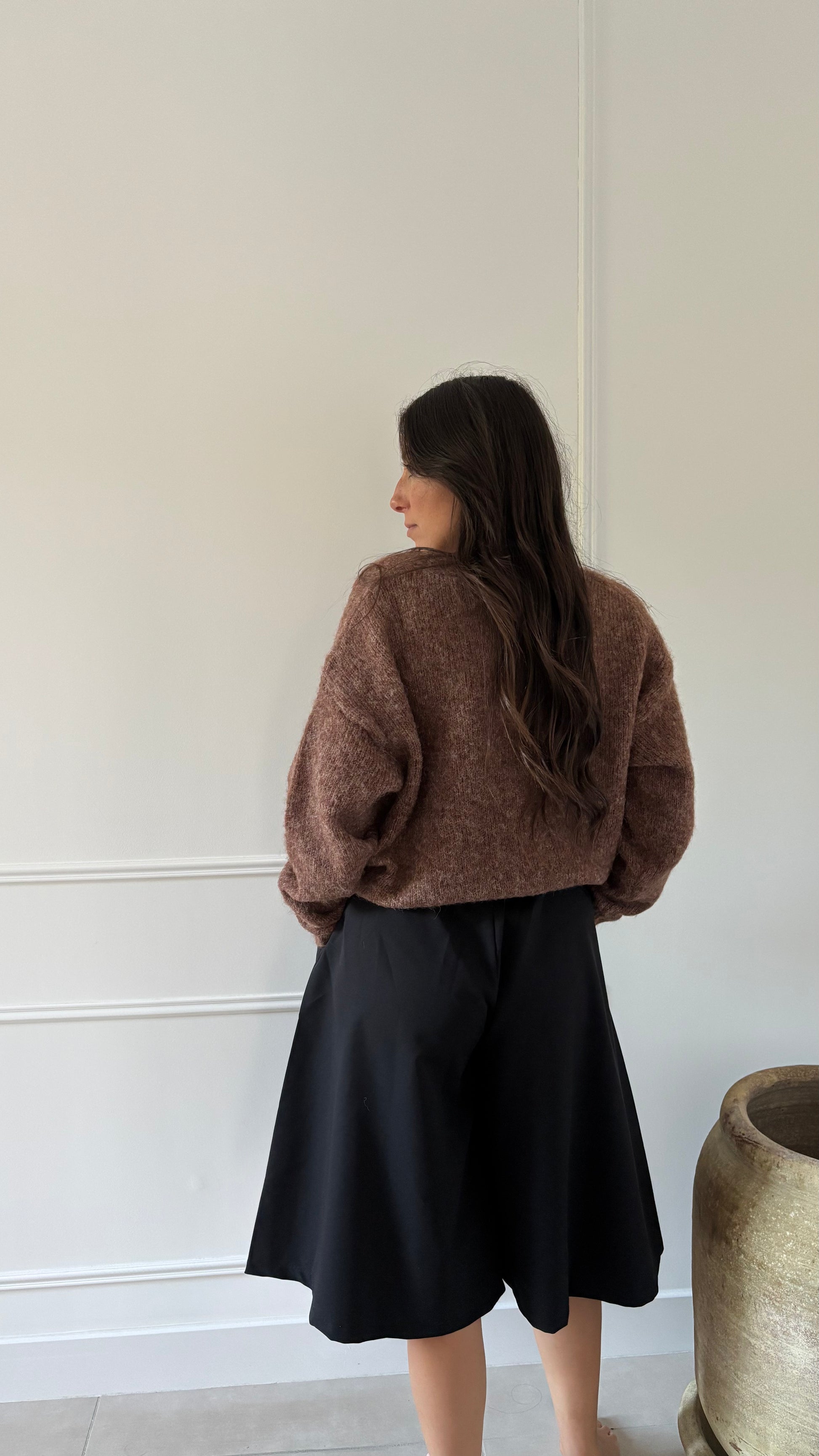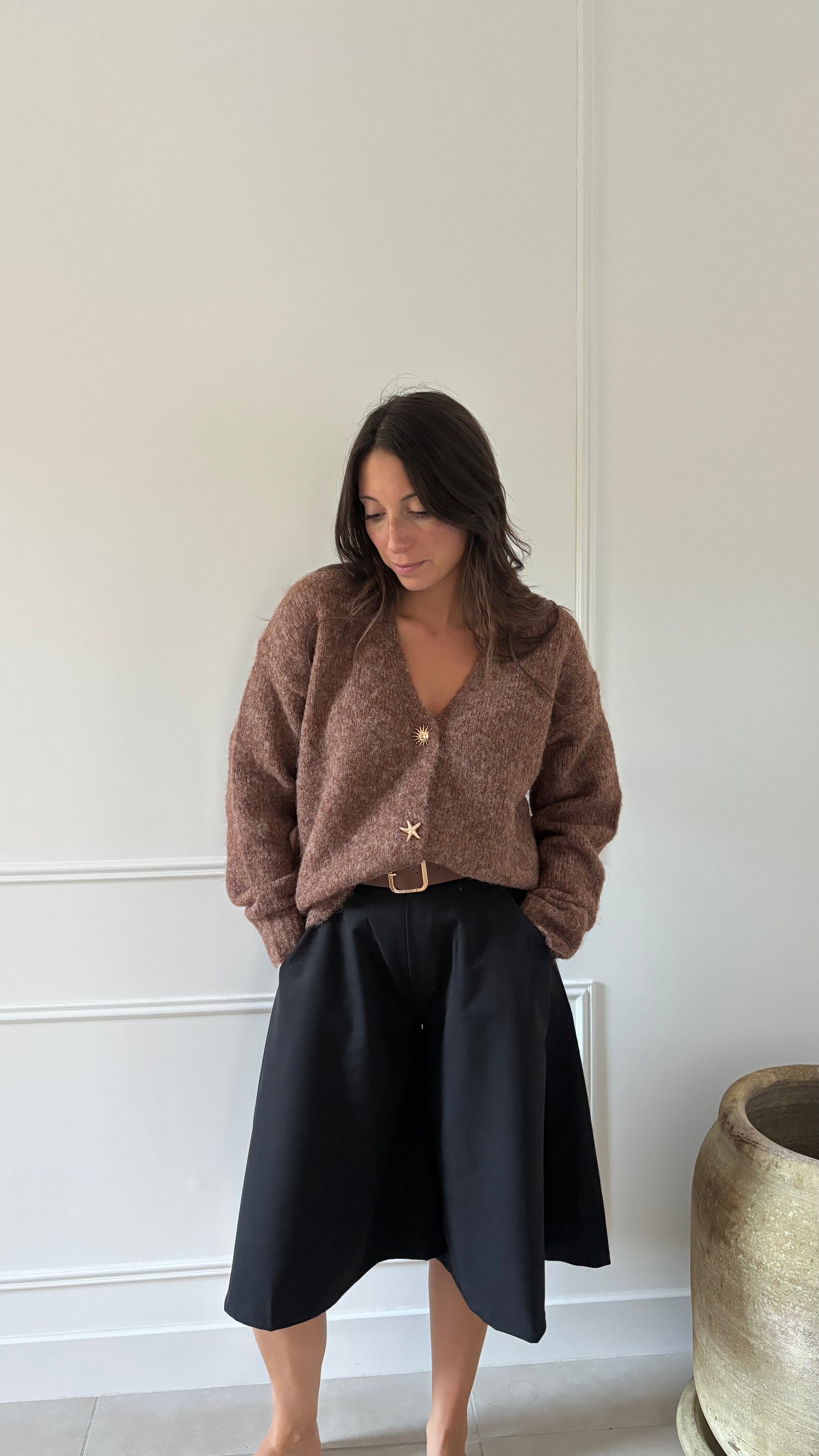 Bermuda jupe-culotte, coupe fluide et confortable. Sa ceinture assortie avec boucle dorée souligne la taille et apporte une touche élégante. Facile à porter au quotidien comme pour une occasion plus habillée.