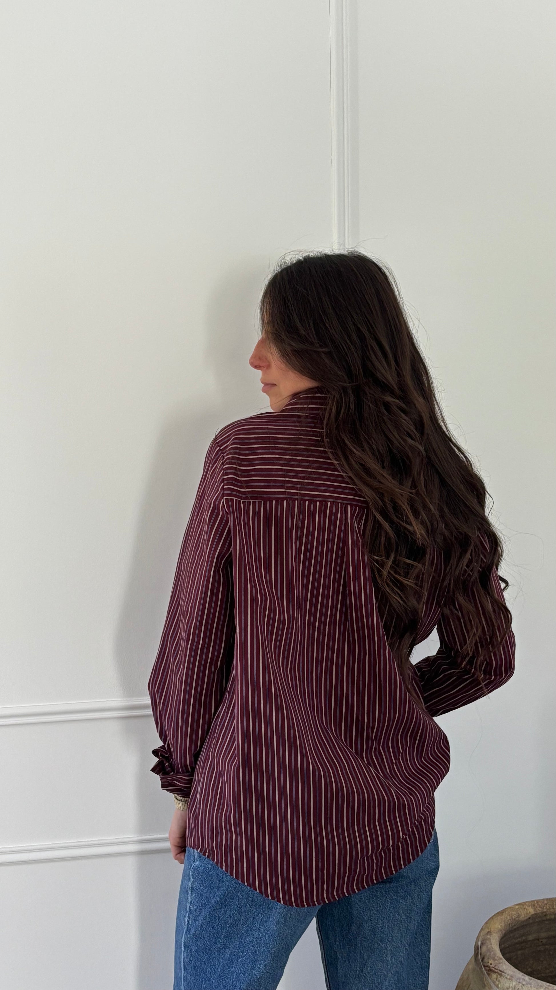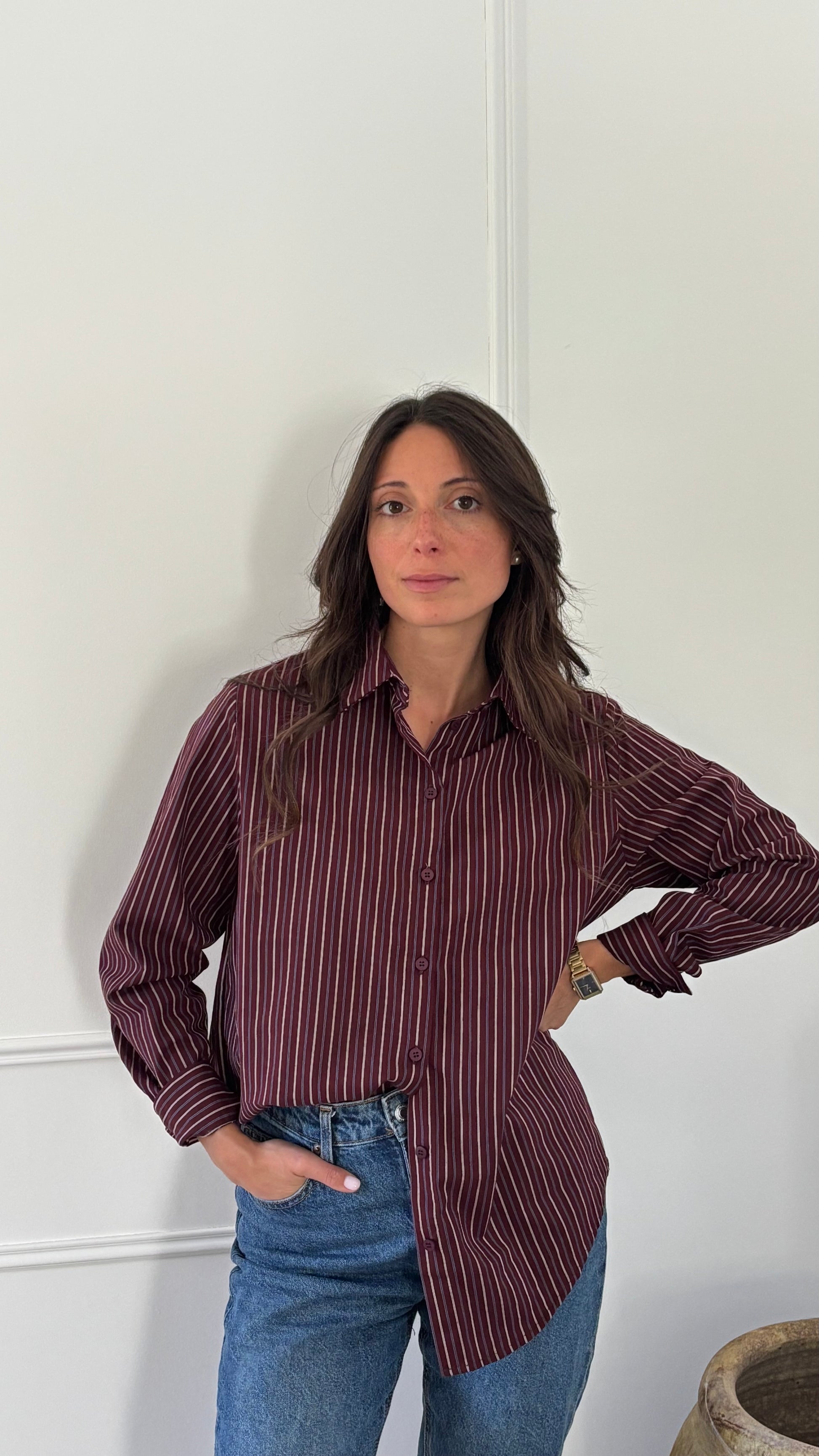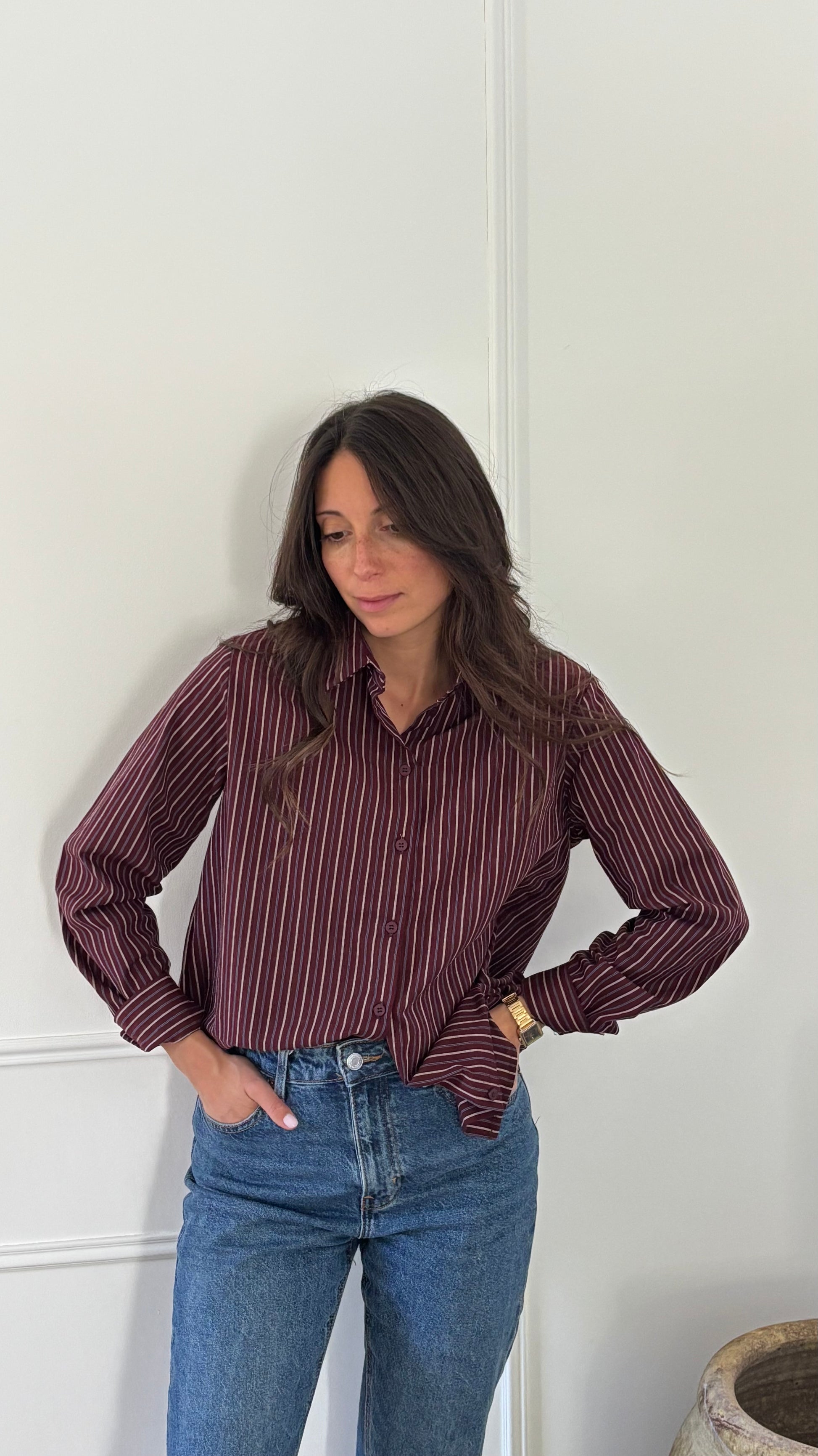 Une chemise à rayures bordeaux, classique et raffinée, idéale pour un look soigné au quotidien.