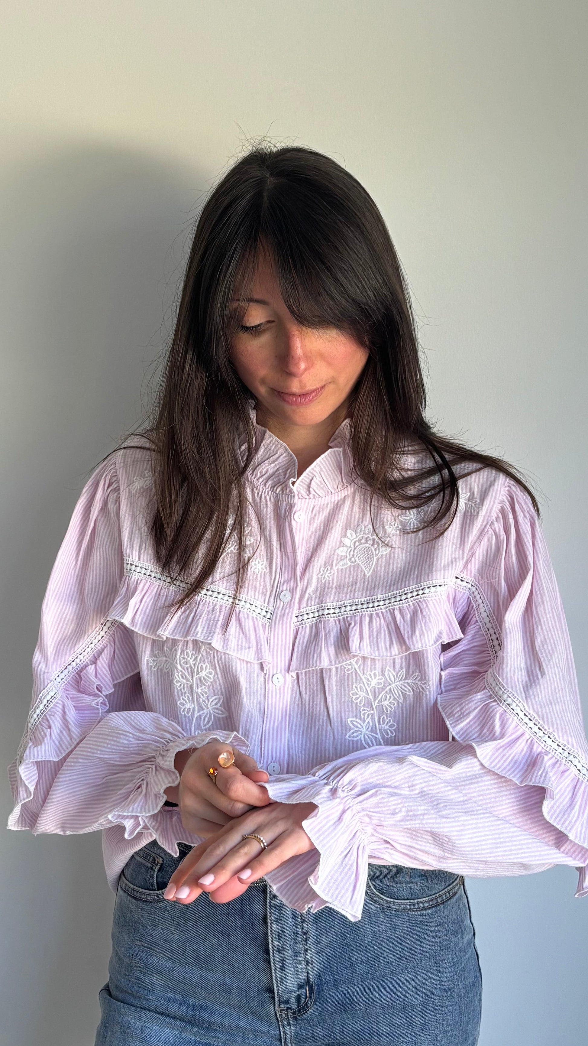 Chemise rayée avec broderies pour une allure élégante et féminine. Une pièce chic qui apporte du caractère à une tenue simple.