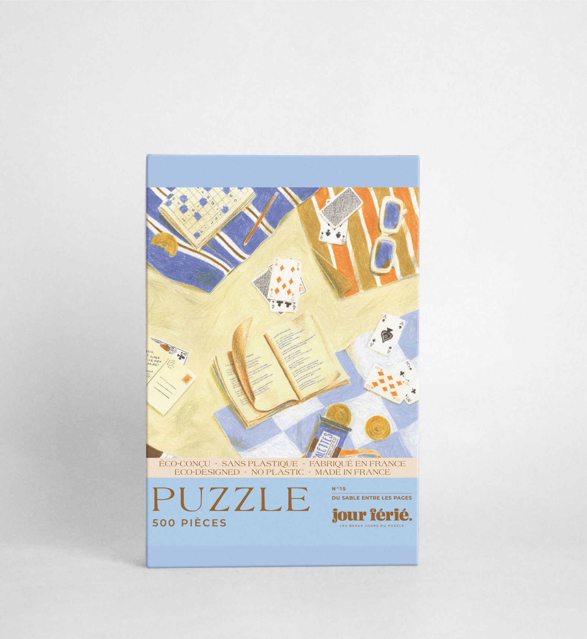 Ce n'est peut-être pas la position la plus confortable pour lire, mais on l'attend avec impatience ! Alors on sort le roman de l'été, quelques mots fléchés, des cartes et un petit casse-croûte pour que ce moment dure toute l'après-midi. Ne vous y trompez pas, ce puzzle de 500 pièces est petit, mais avec son camaïeu de beige et de bleu, il va faire durer votre plaisir de puzzler.