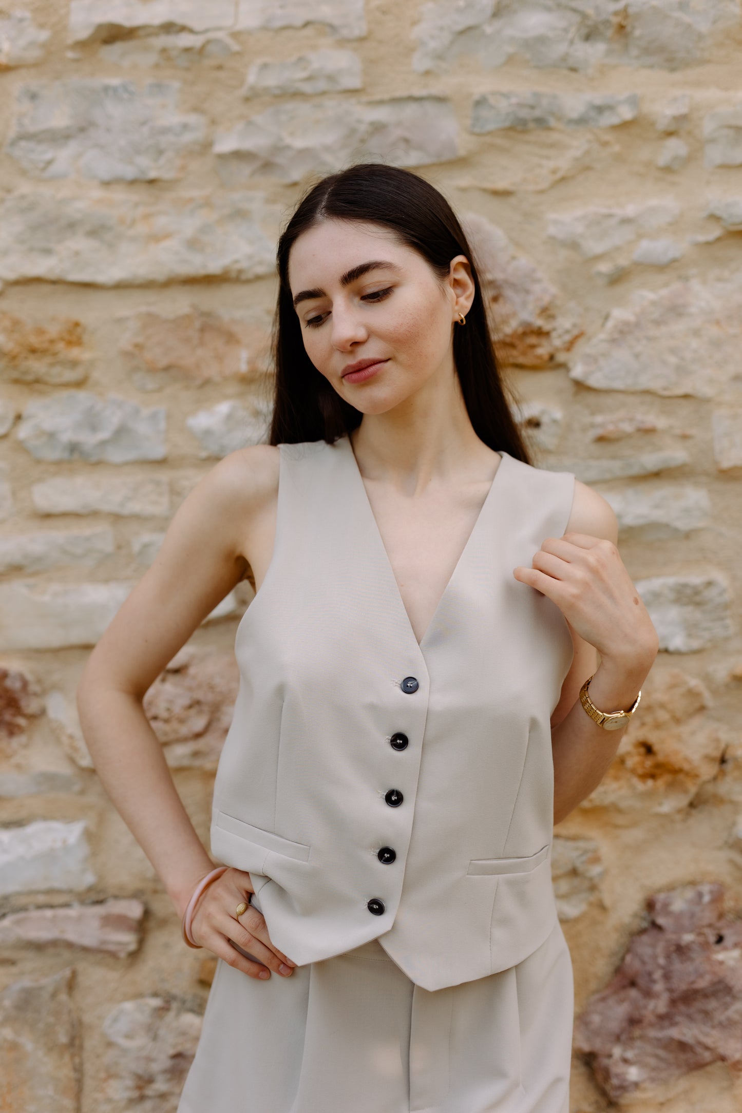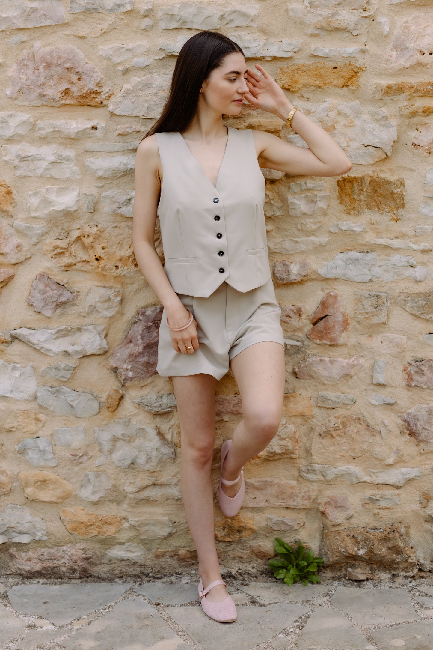 Gilet de costume sans manches, boutonné sur le devant pour un look chic et élégant. Il se porte parfaitement avec le short assorti, pour un ensemble coordonné et sophistiqué.