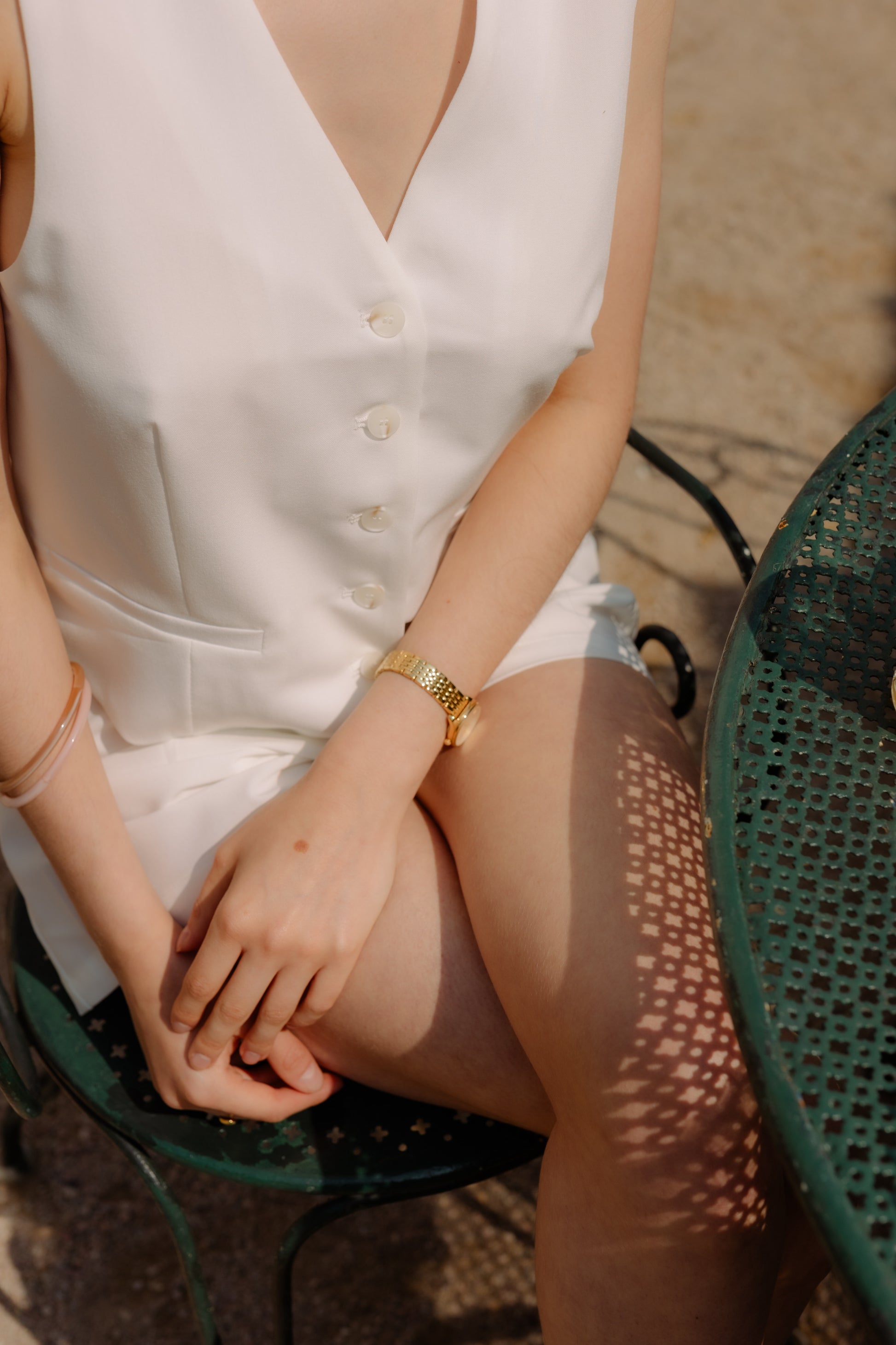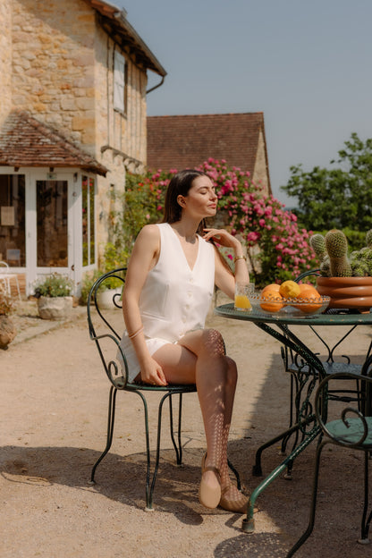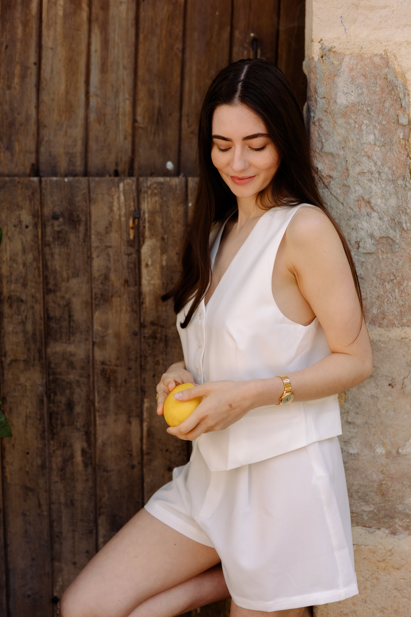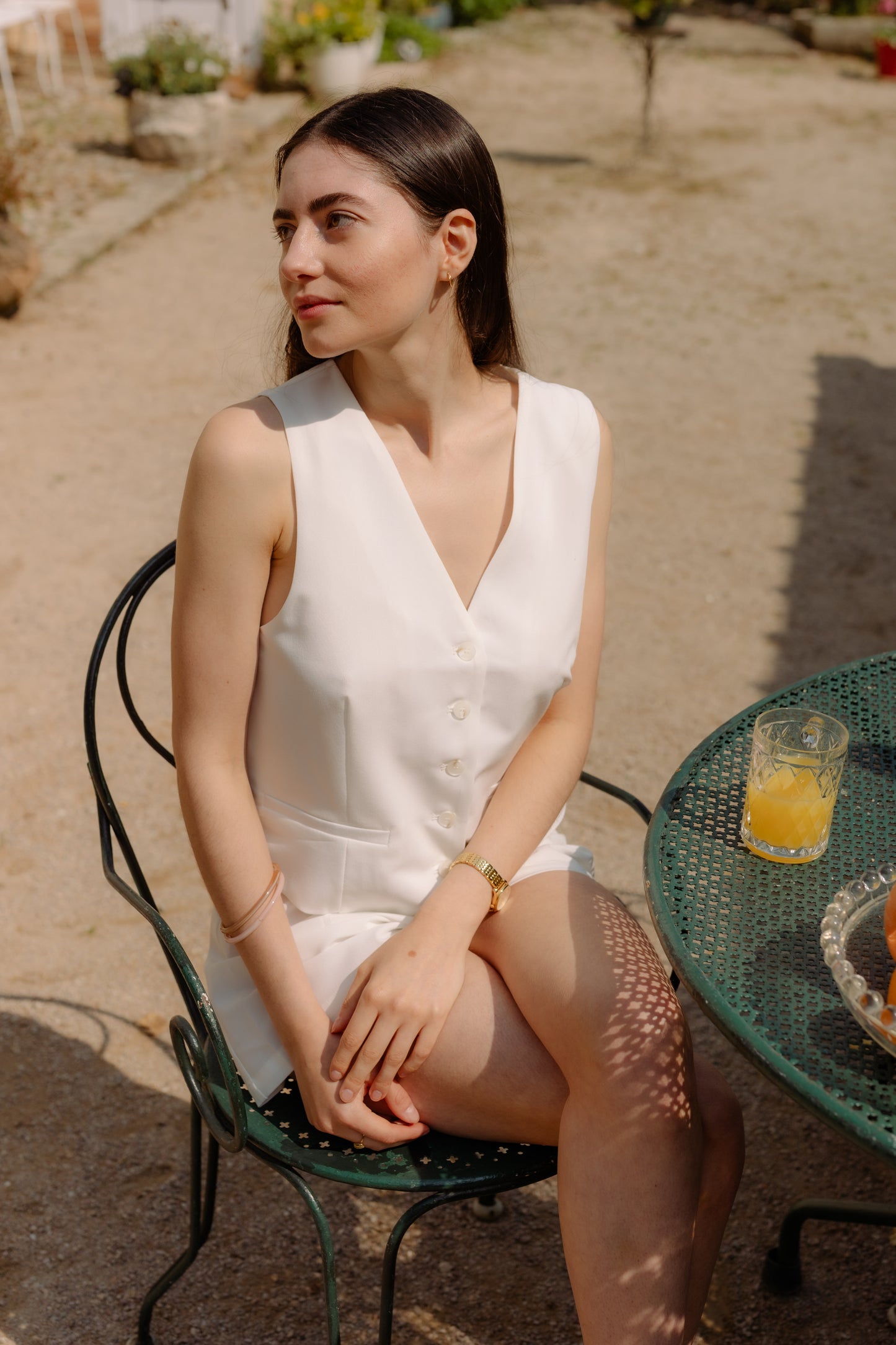 Gilet de costume sans manches, boutonné sur le devant pour un look chic et élégant. Il se porte parfaitement avec le short assorti, pour un ensemble coordonné et sophistiqué.