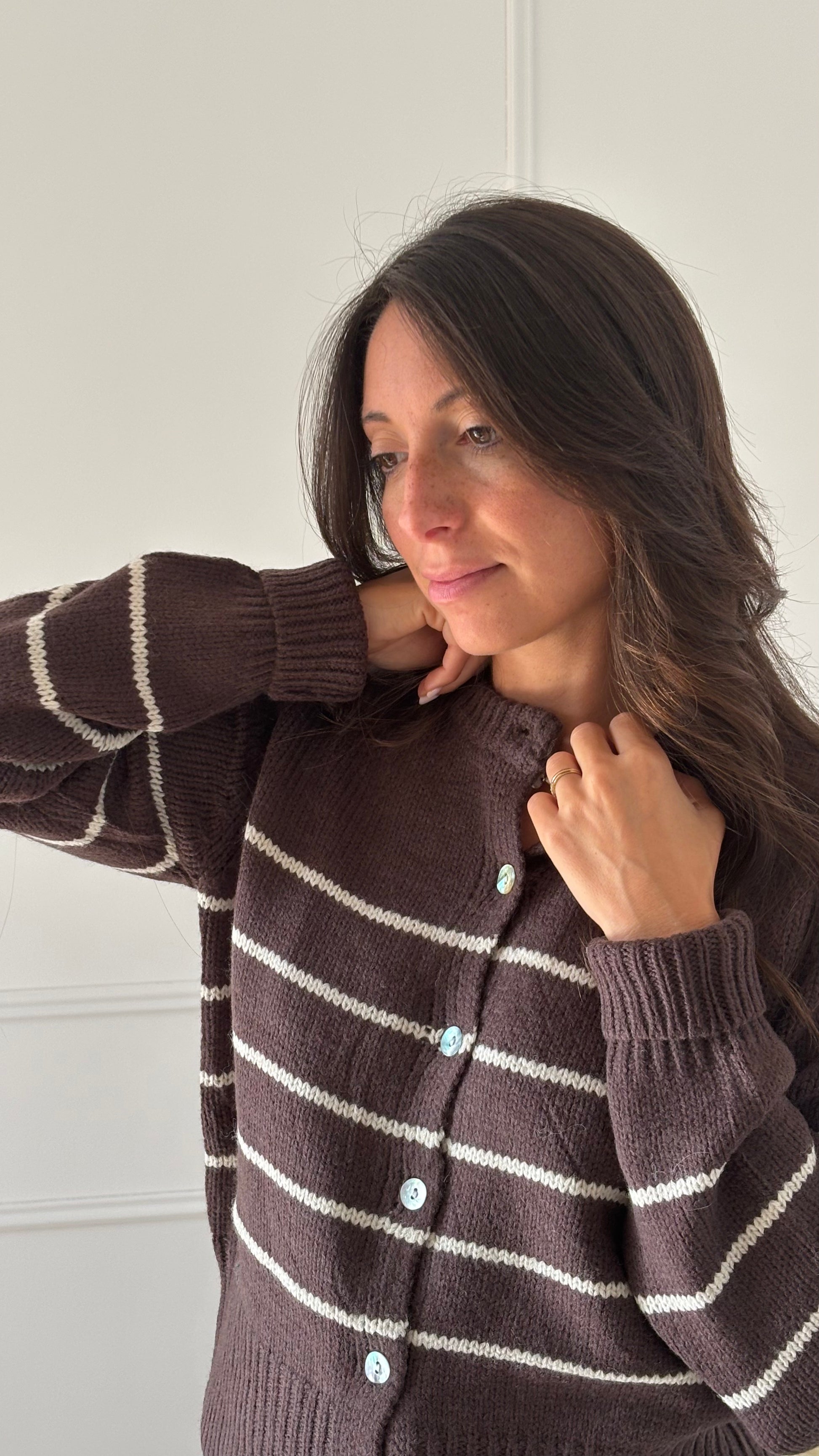 Un gilet cozy et stylé qui apporte chaleur et élégance à vos tenues. Sa maille douce et ses rayures crème apportent une touche graphique discrète et moderne, parfait pour superposer sur un t-shirt ou une chemise.