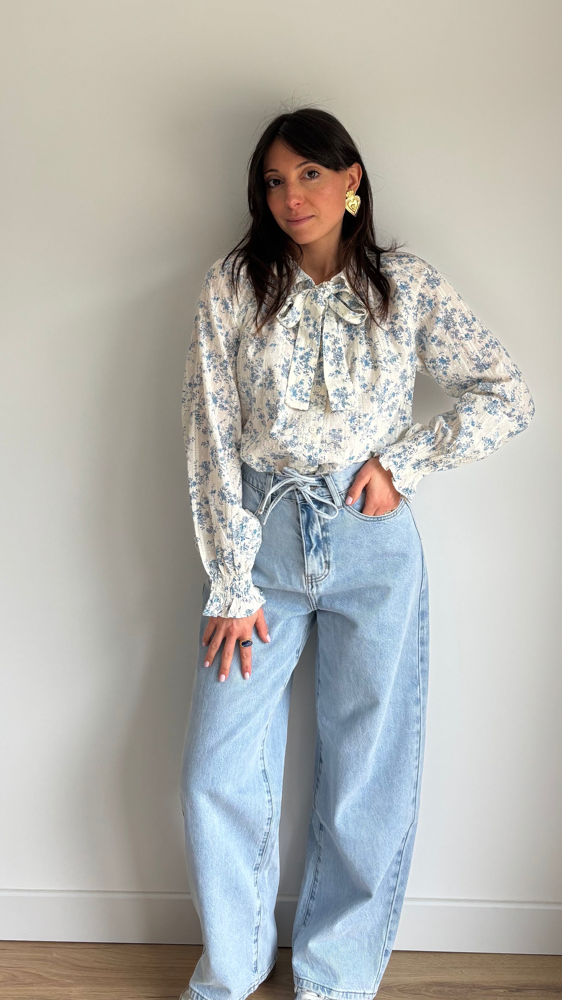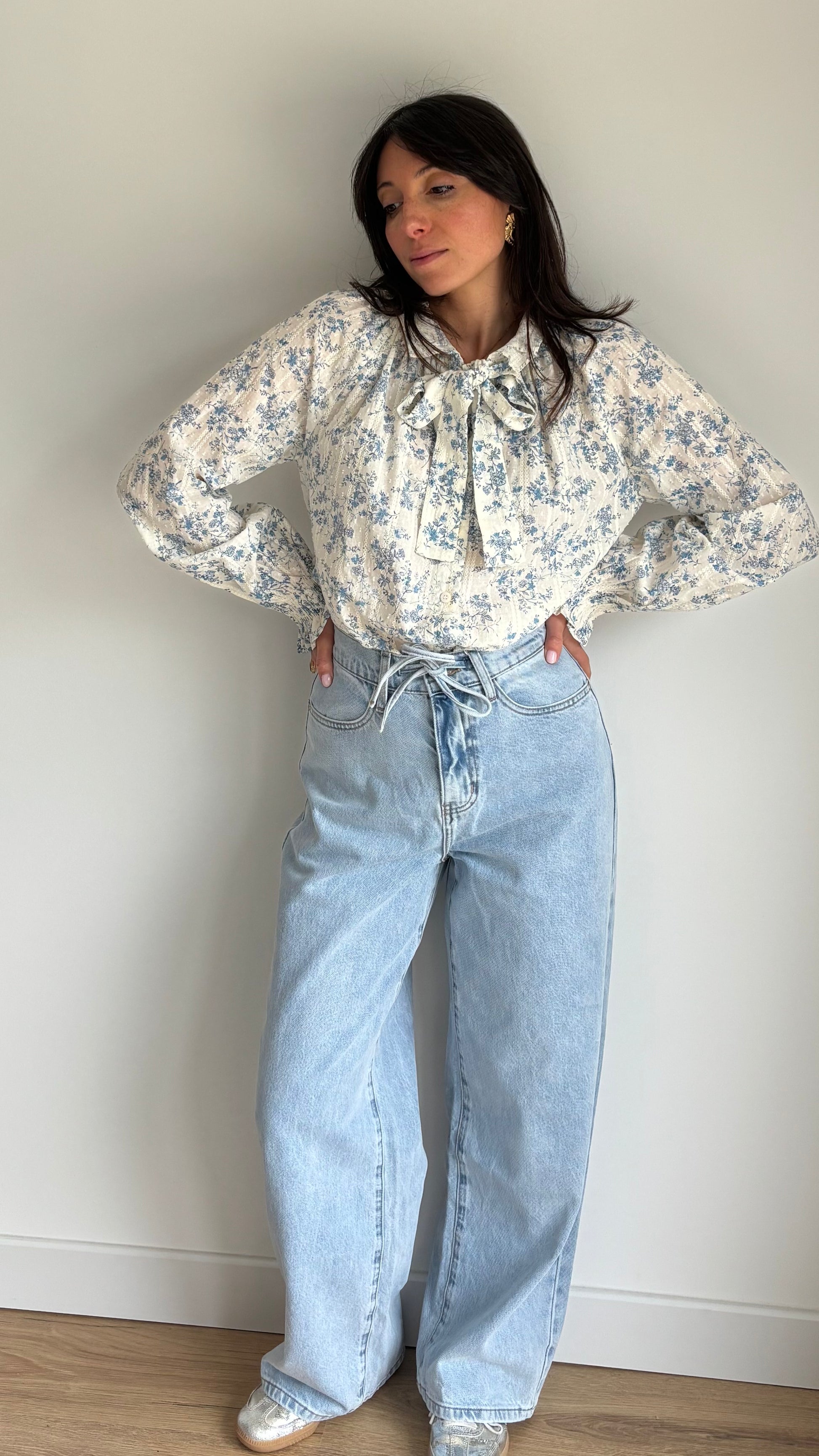 Jeans coupe droite large pour un look décontracté et tendance. Le cordon à la taille permet d’ajuster le fit selon vos envies et apporte une touche casual. Facile à porter avec un tee-shirt, un pull ou un body.