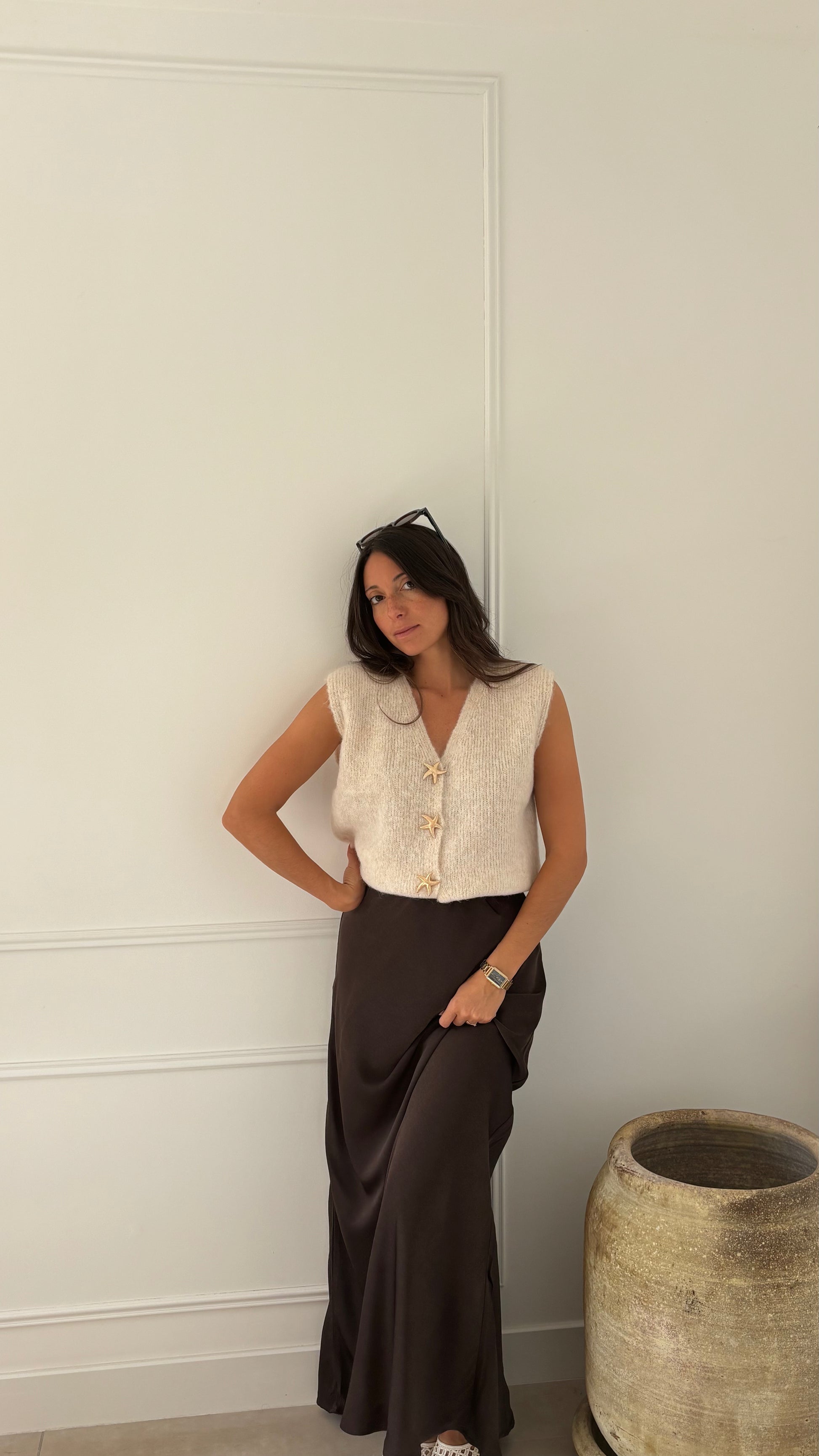 Une jupe longue élégante et fluide qui apporte sophistication et légèreté à vos tenues. Sa matière satinée glisse doucement et crée de jolis mouvements à chaque pas, idéale pour un look chic ou décontracté selon vos envies.