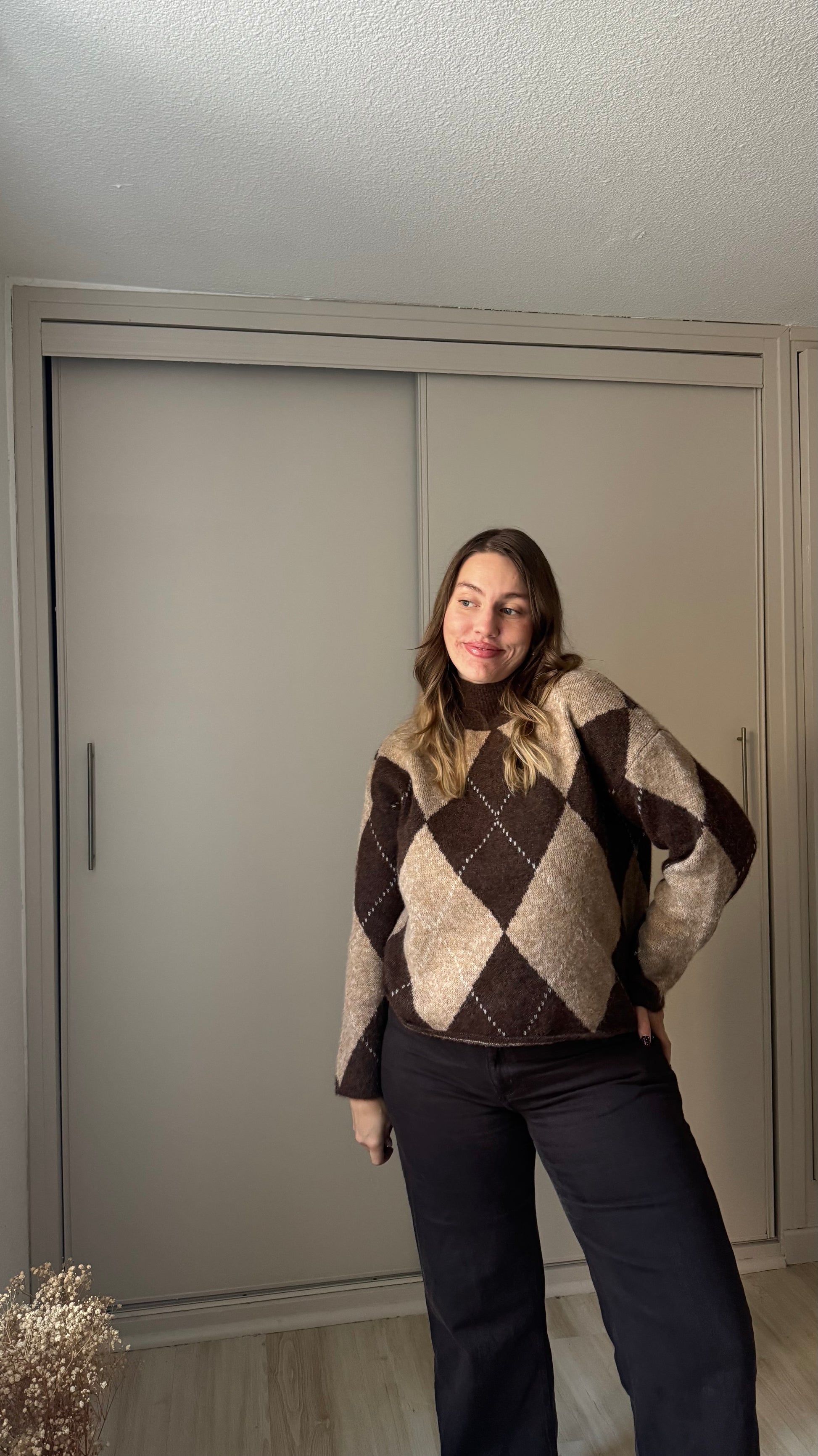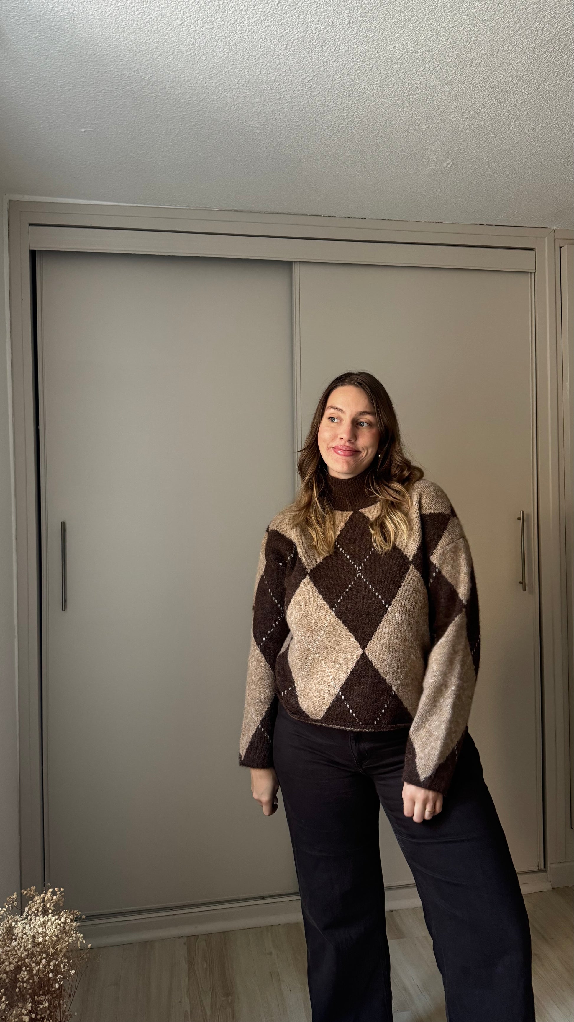Pull jacquard chocolat et taupe, le genre de pièce qu’on enfile sans réfléchir et qui transforme instantanément un look. Confortable, chaud juste ce qu’il faut, et hyper tendance grâce à son motif graphique.