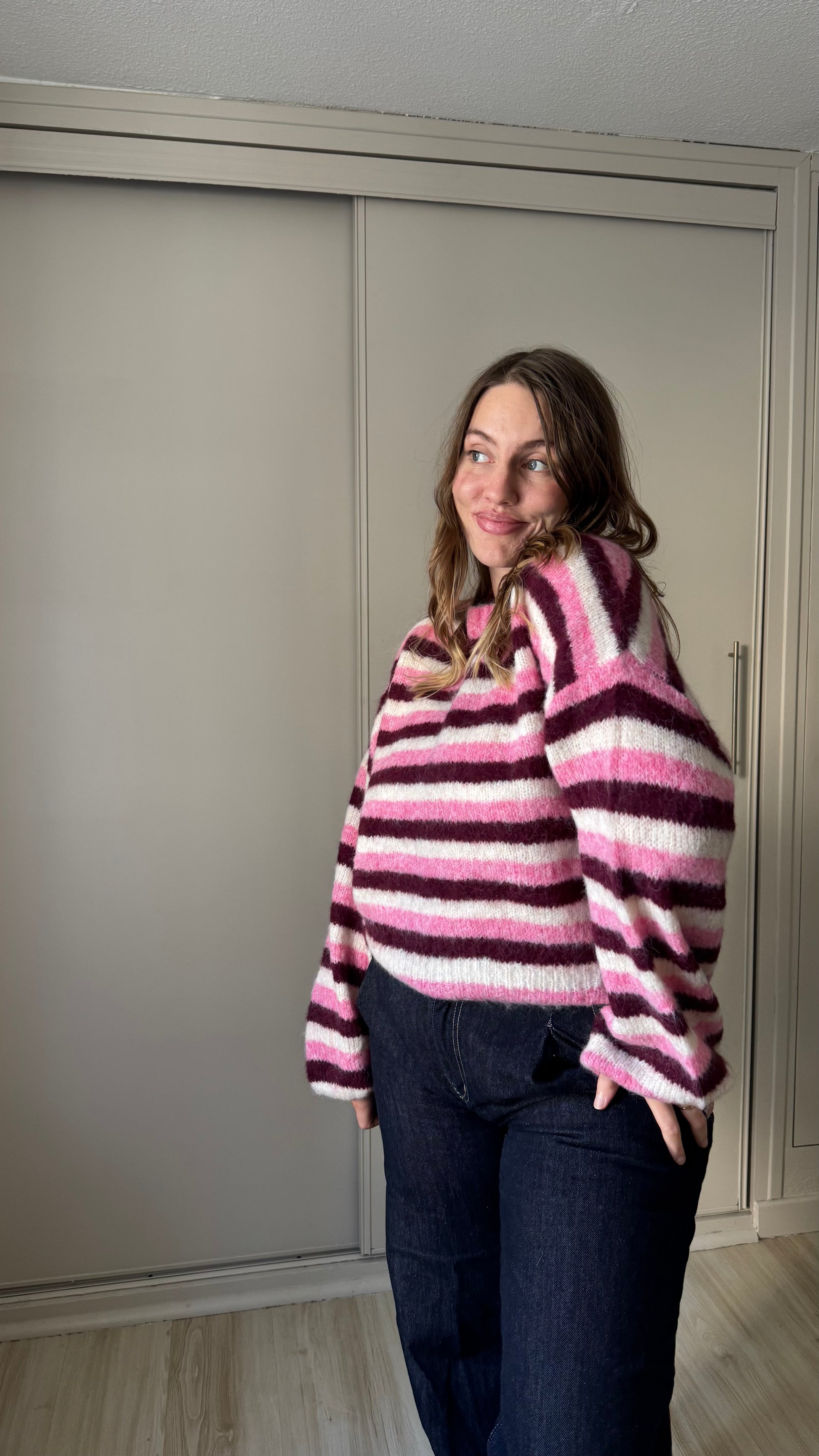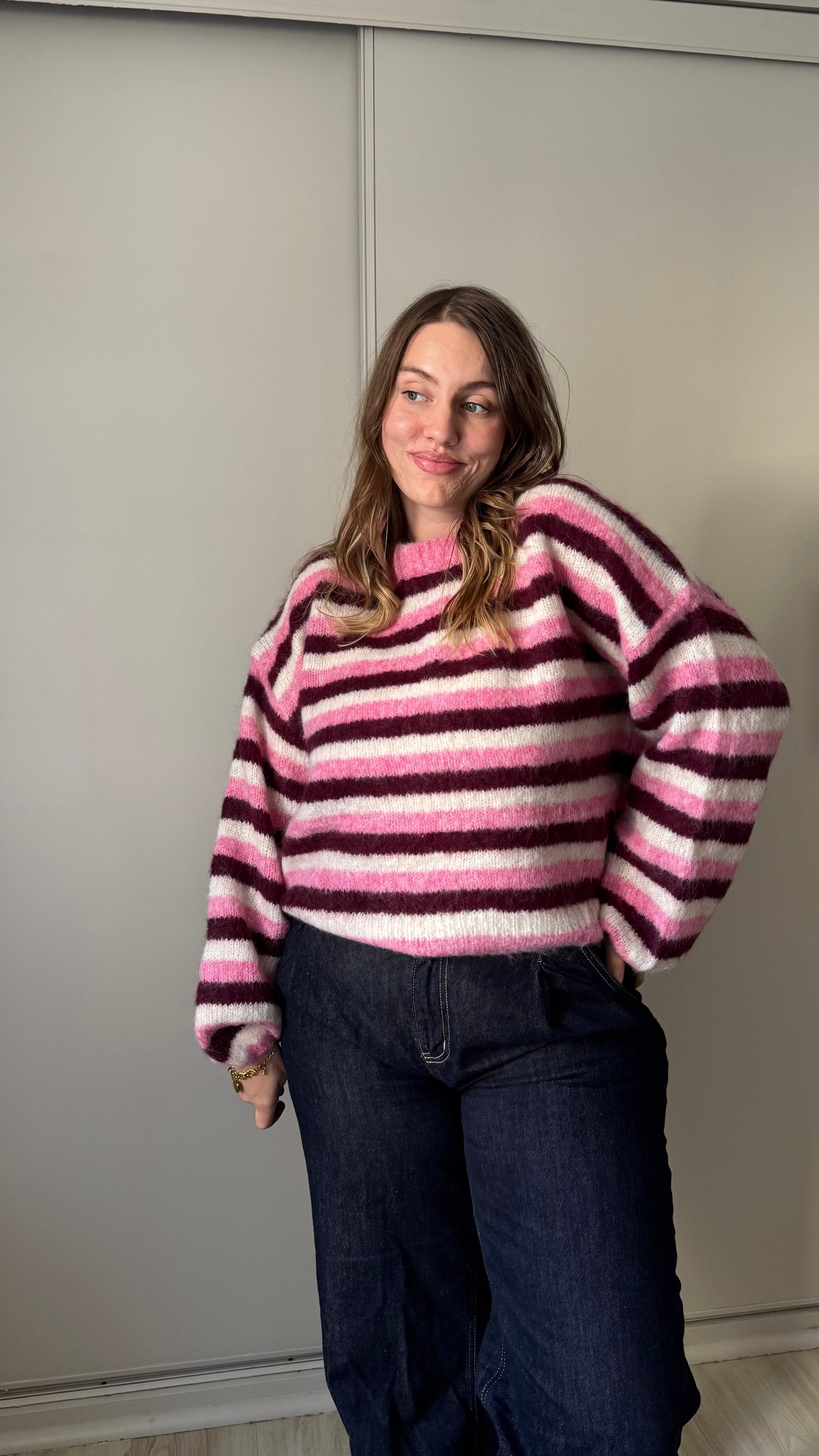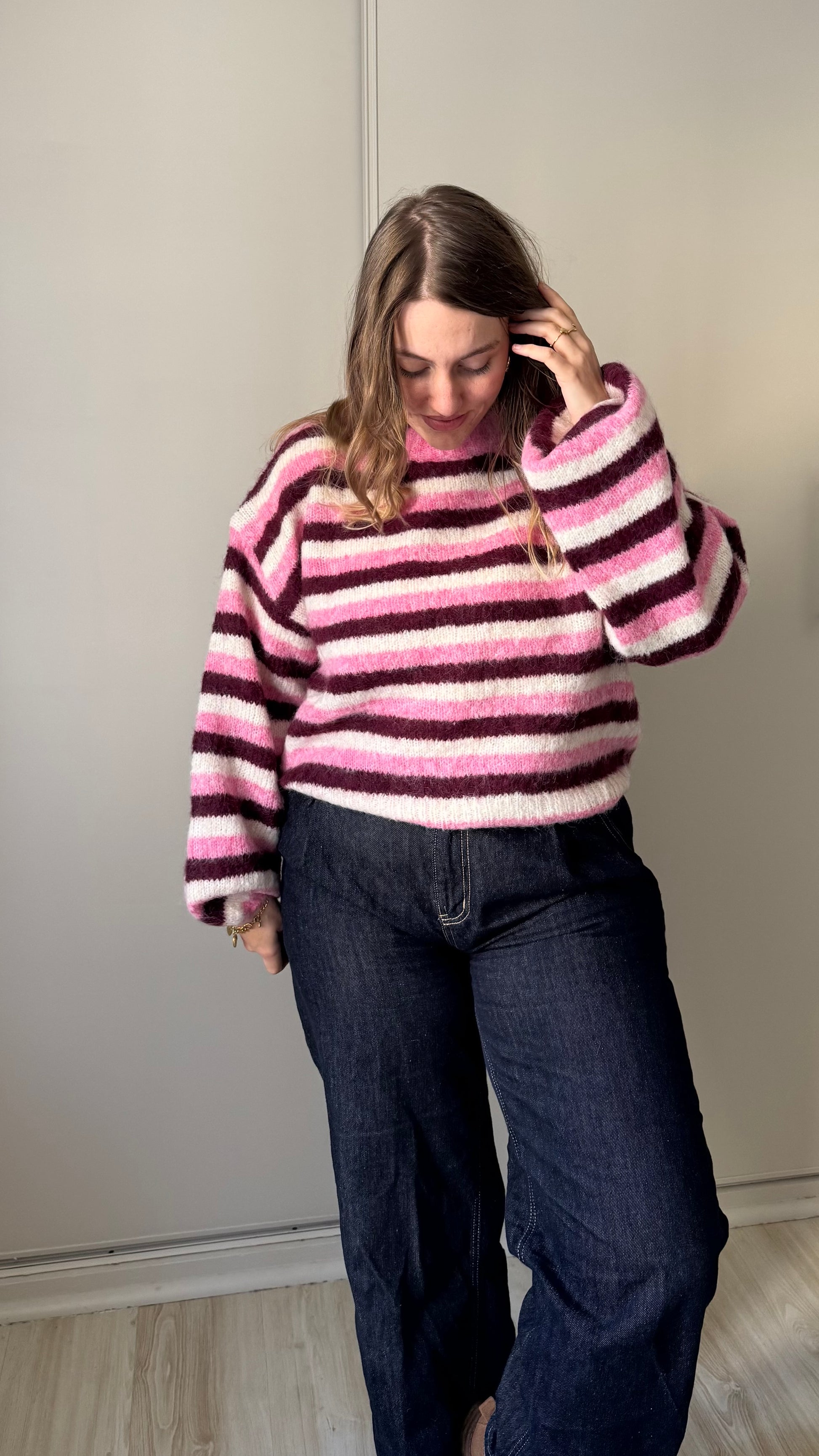 Un pull à rayures rose et bordeaux, confortable et facile à porter au quotidien.