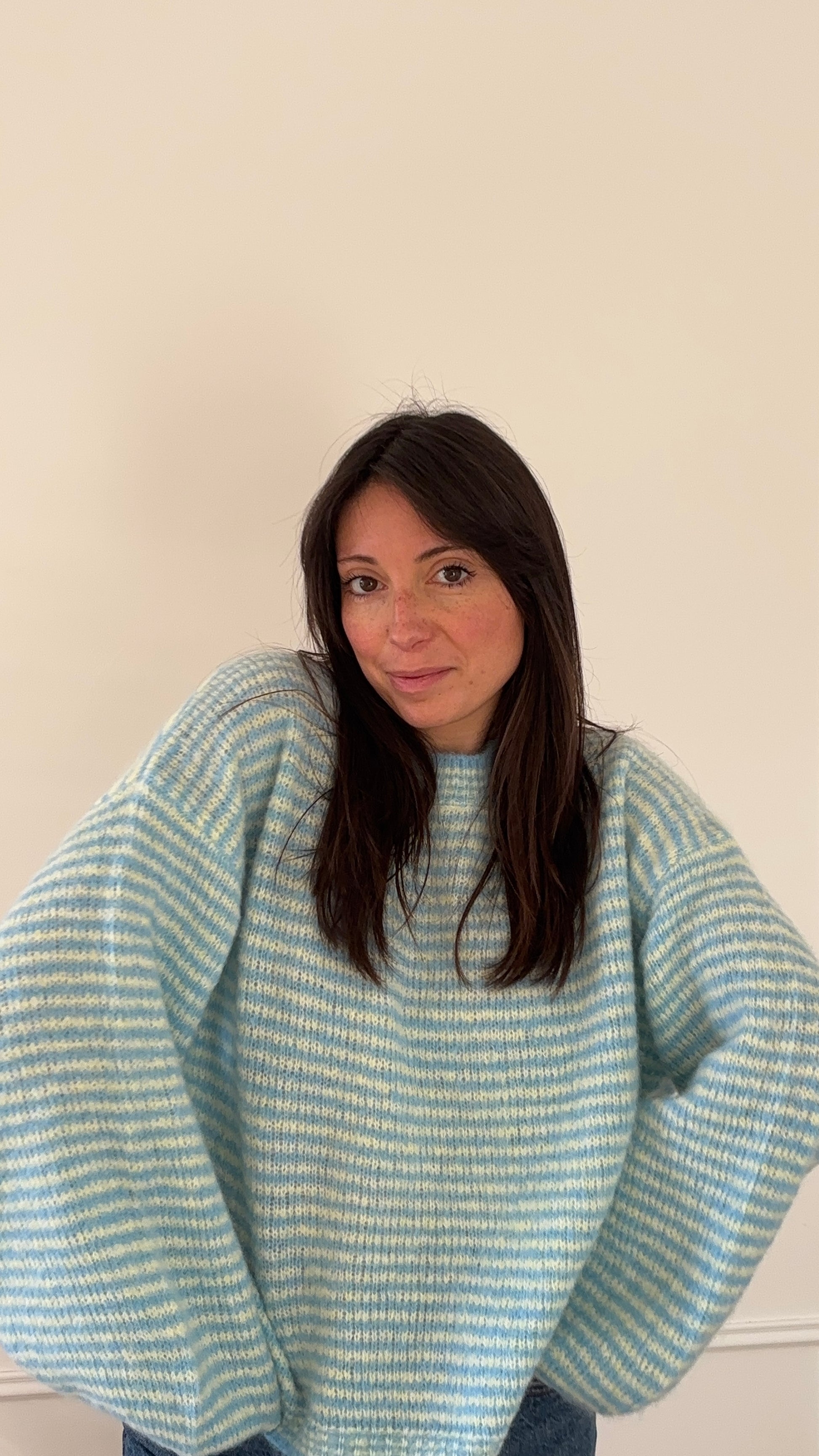 Les rayures jaunes réveillent le bleu et donnent du caractère à la tenue sans en faire trop.
