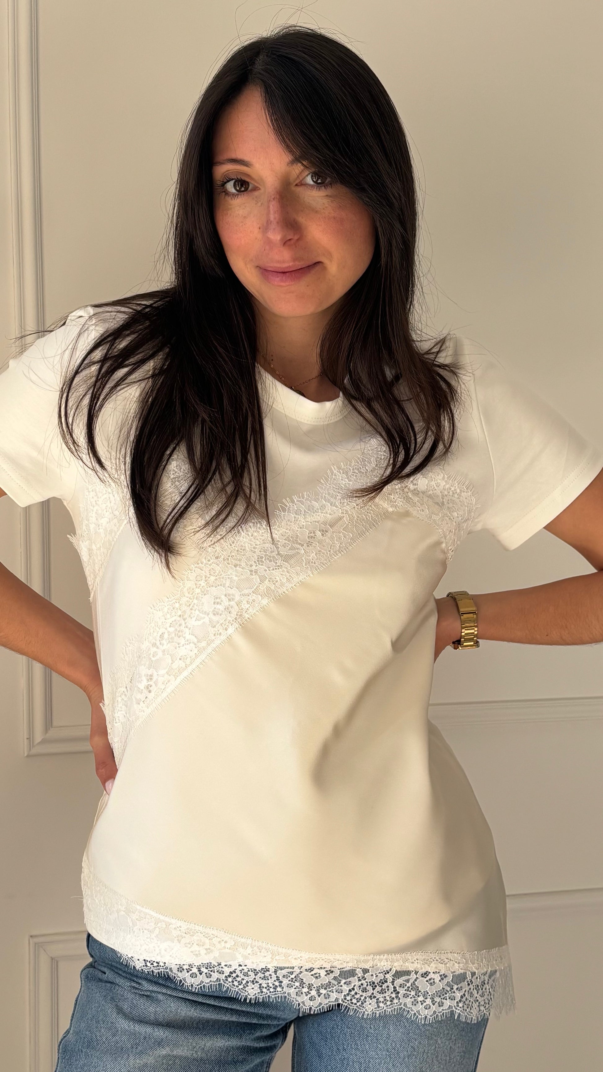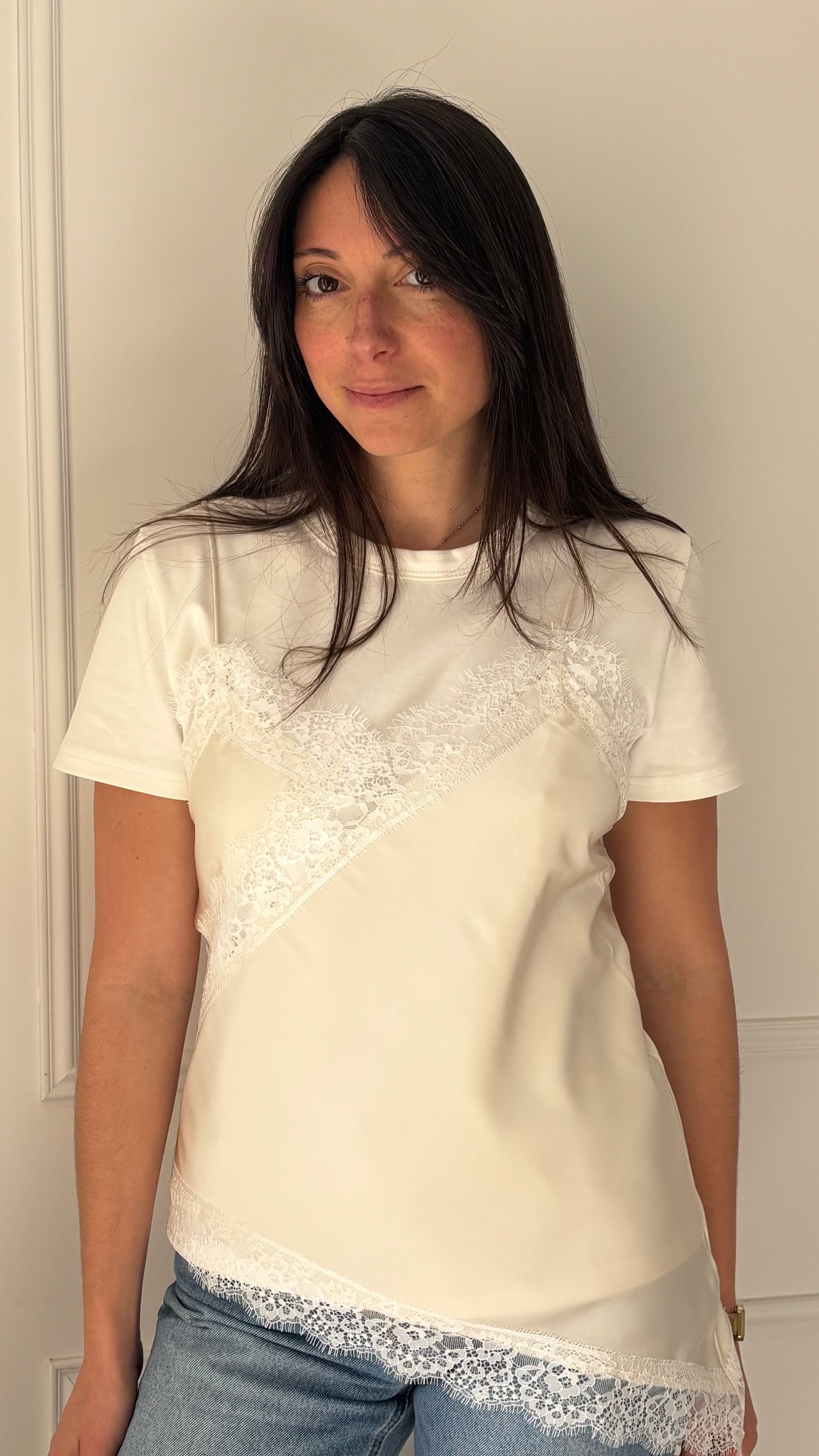 Top asymétrique en satin et dentelle, fluide et élégant. Se porte facilement en superposition, sur un t-shirt basique ou même en dessous pour varier les styles.
