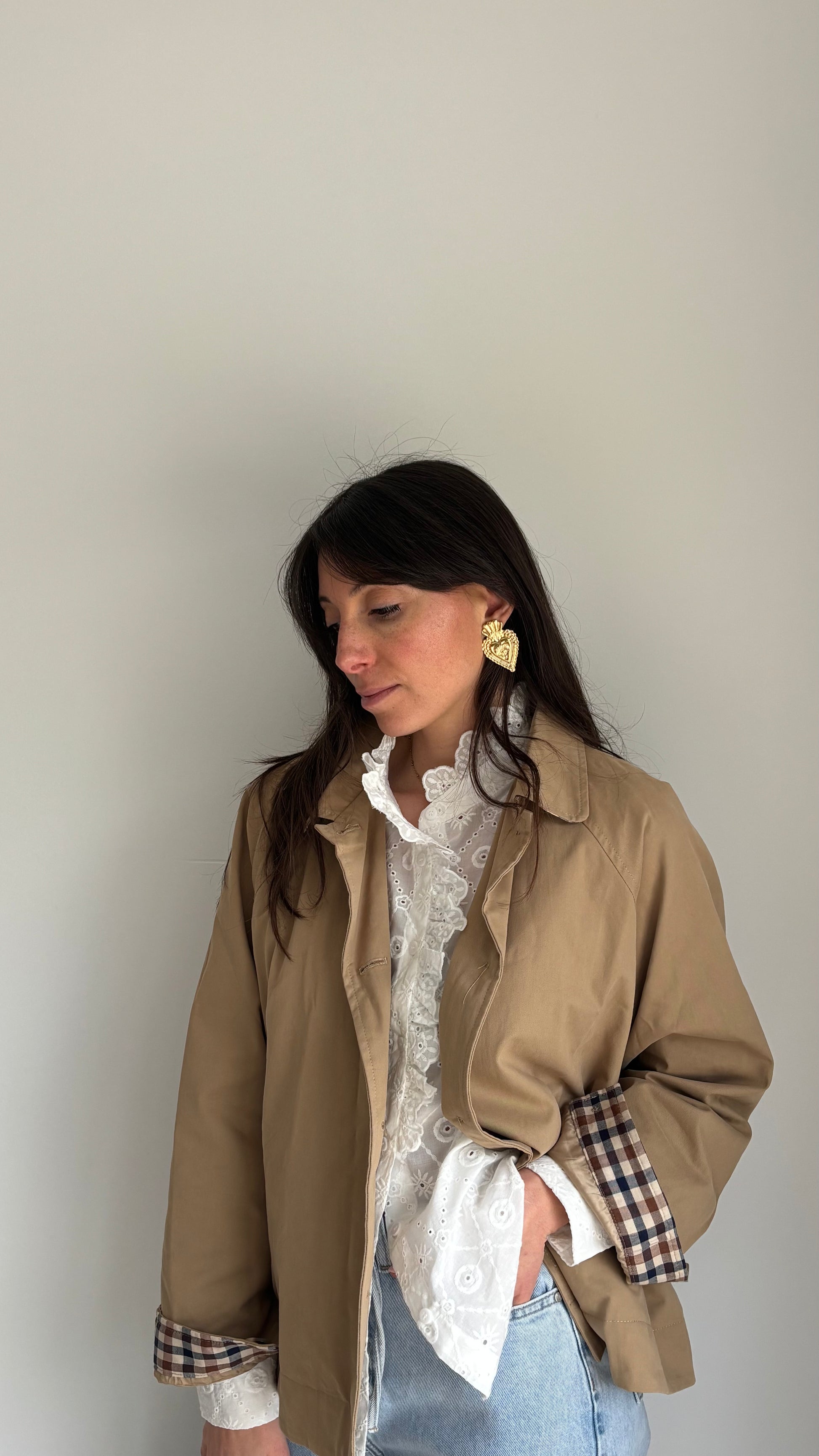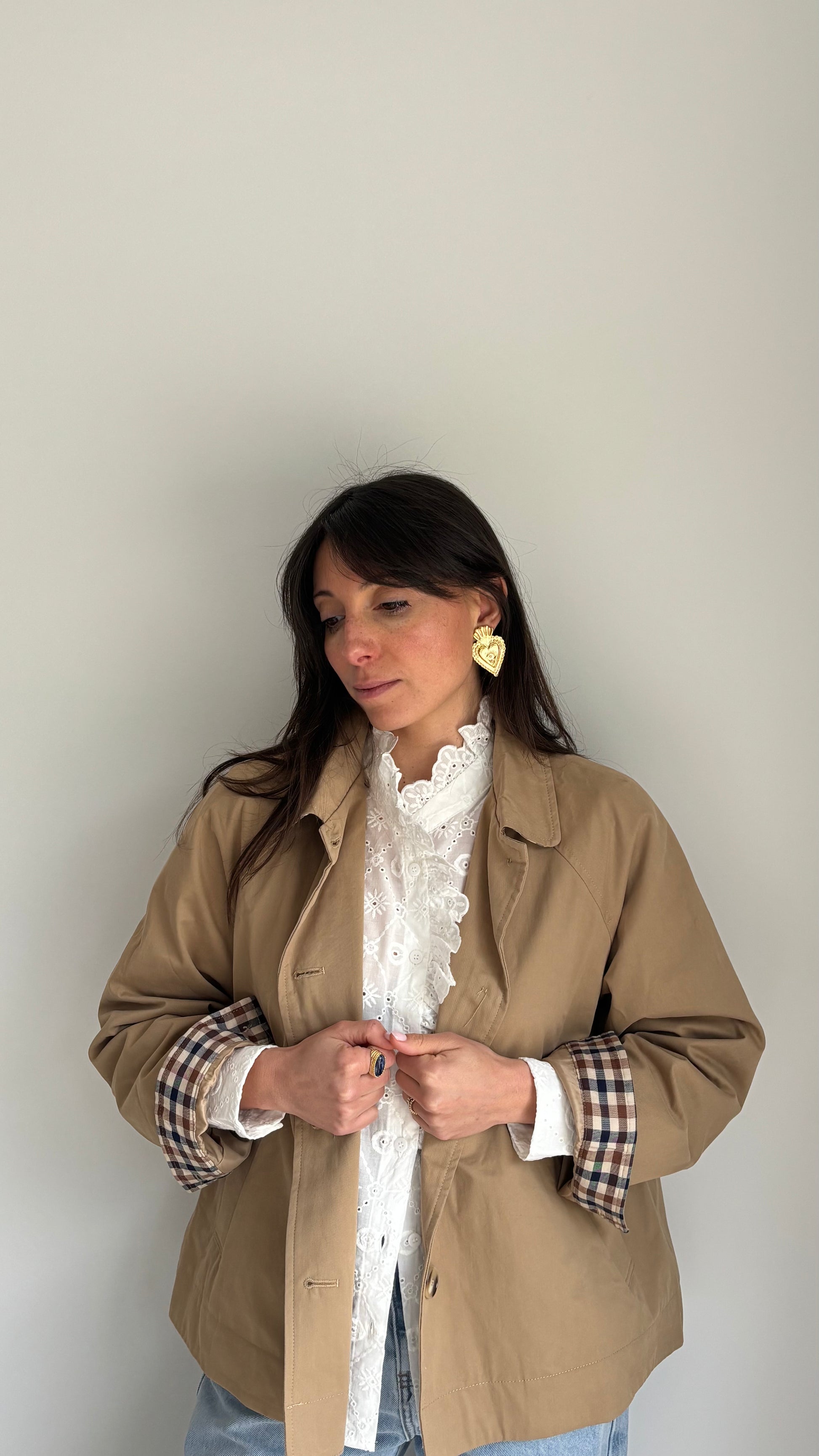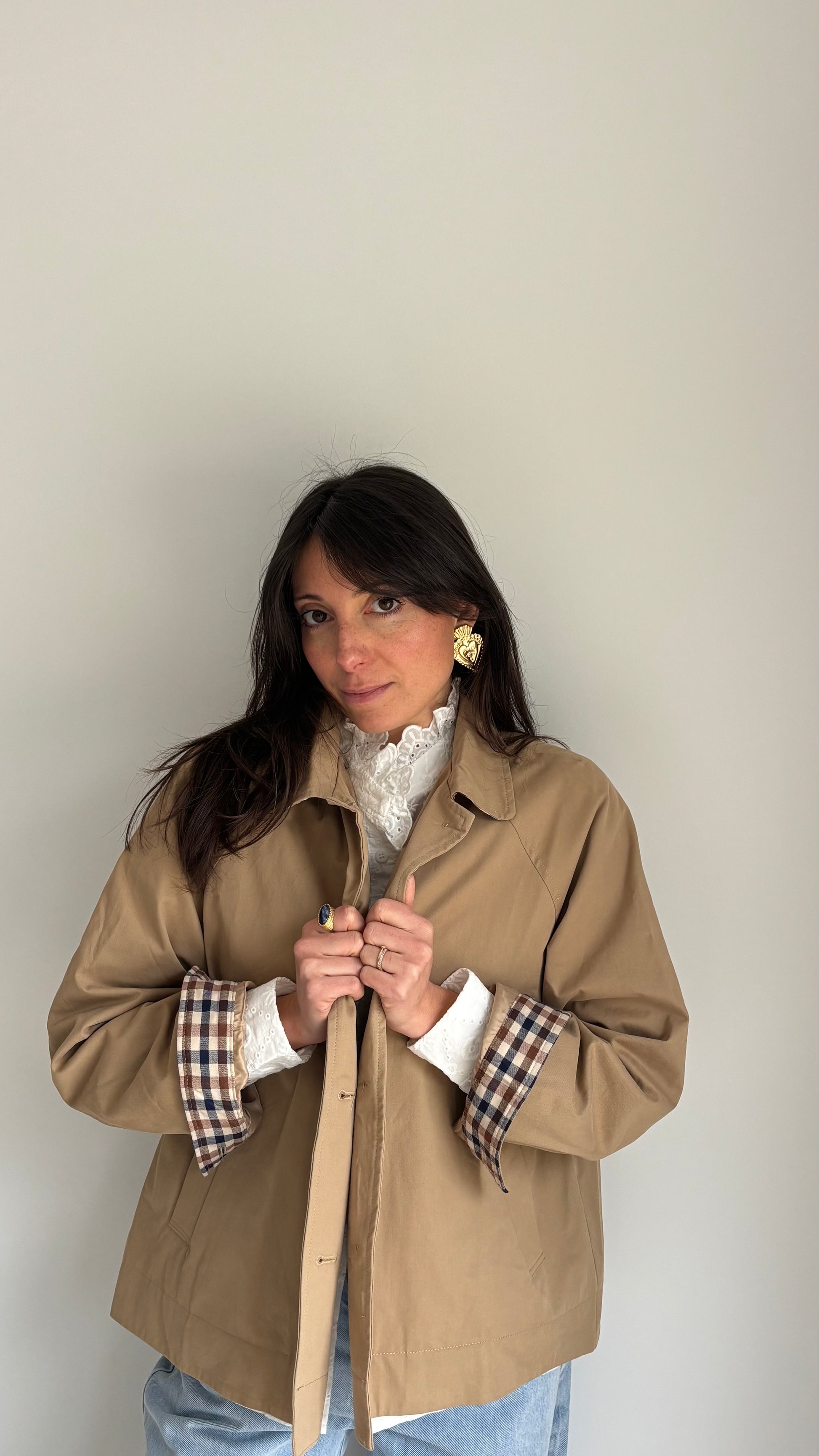 Trench court élégant avec détail carreaux à l’intérieur des revers de manches pour une touche originale et tendance. Facile à porter au quotidien, il complète parfaitement une tenue casual ou plus habillée.